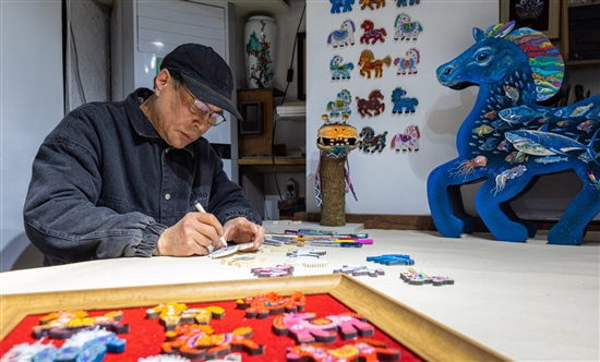 1月30日,在石桥头镇三透里文创园的工作室内,温岭市非物质文化遗产传承人陈祥来正专注于马年主题文创作品的创作。他将老树桩、蟹壳等废弃材料作为画布,把马年生肖元素与本土海洋文化巧妙融合,勾勒出灵动的图景。近年来,陈祥来始终坚持“用在地素材讲本土故事”。此次创作不仅延续了他以生肖文化为主题的年度艺术实践,也为当地文创园增添了浓郁的新春艺术气息。