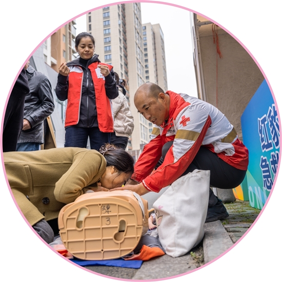 “我的社区”启动仪式现场,红豹救援队教学急救知识。