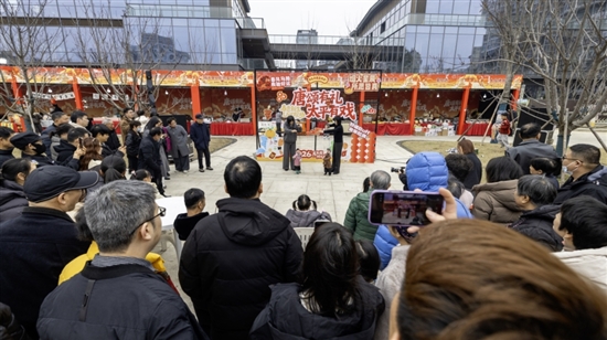2月17日,太平街道月河天地文化街区内,非遗文化市集上,游客观看提线木偶演出。