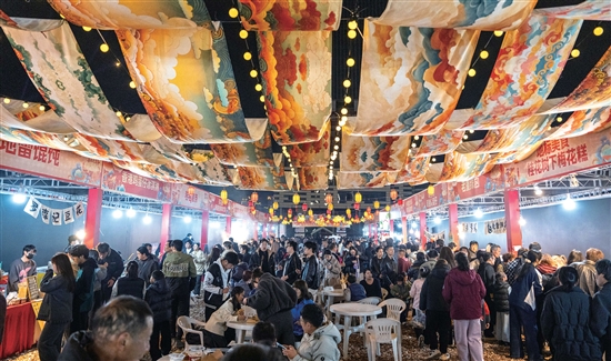随着夜色渐深,市集越发热闹起来。在“妙不可言”美食区里,50余家本土摊位飘散出阵阵香气,食客们排起长队。炸得金黄的泡虾、热气腾腾的鱼肉圆、香甜软糯的梅花糕……市民们在赏灯之余大快朵颐。
