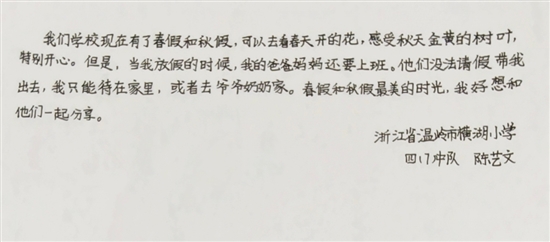 “我们学校现在有了春假和秋假,可以去看春天开的花,感受秋天金黄的树叶,特别开心。但是,当我放假的时候,我的爸爸妈妈还在上班。他们没法请假带我出去,我只能待在家里,或者去爷爷奶奶家。春假和秋假最美的时光,我好想和他们一起分享。”陈艺文在信中写道。