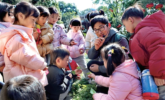 3月10日,太平街道卖鱼桥社区组织太平街道中心幼儿园坊巷里园区的孩子们走进虎山公园,认识春日的植物,寻觅春天的踪迹,在互动问答间感受春天之美,感知季节更替规律。通讯员 张鲜红 摄