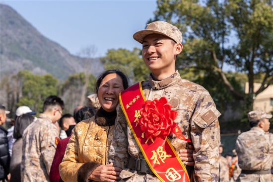 欢送大会在雄壮嘹亮的国歌声中拉开序幕。欢送大会上,新兵们身着戎装、胸佩红花、肩披绶带,身姿挺拔,目光坚毅。唐祝山宣读了温岭市2026年上半年新兵入伍命令。新兵代表和新兵家长代表分别上台发言。随后,新兵代表们到达主席台指定位置,庄重地接过“阳光温岭”城市徽章——国防有我纪念章。