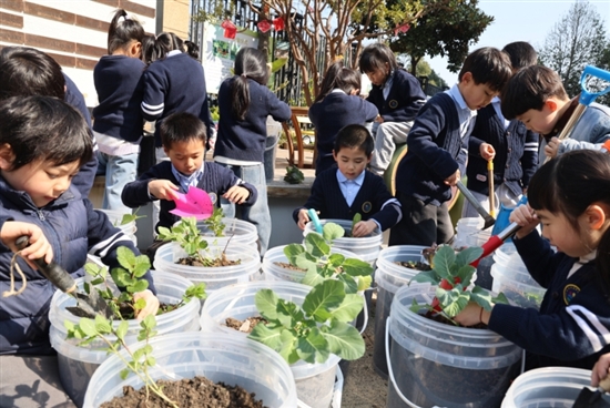 捐书仪式后,大班的小朋友拿起小铲子,来到园内种植区。松土、挖坑、播种……孩子们忙得不亦乐乎,亲手种下土豆、薄荷、向日葵花籽等植物,体验劳动的乐趣,期待生命的萌芽。