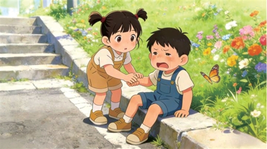 行行被一只美丽的蝴蝶深深地吸引住了。他紧紧盯着蝴蝶,往前一扑,想要捉住它。蝴蝶轻轻一躲,行行重重地摔在了地上,立刻哇哇大哭起来。