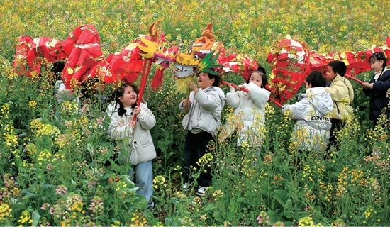 3月20日为春分节气,恰逢“二月二,龙抬头”。3月19日,市中心幼儿园开展“找春天,知农事”活动。在老师的带领下,孩子们走进坞根镇油菜花田,舞龙、放风筝,感受春日气息与传统农耕文化。记者 周学军 摄