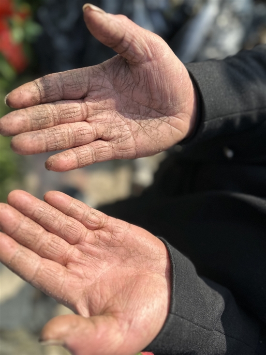 梁妙根的手有明显的沟壑。
