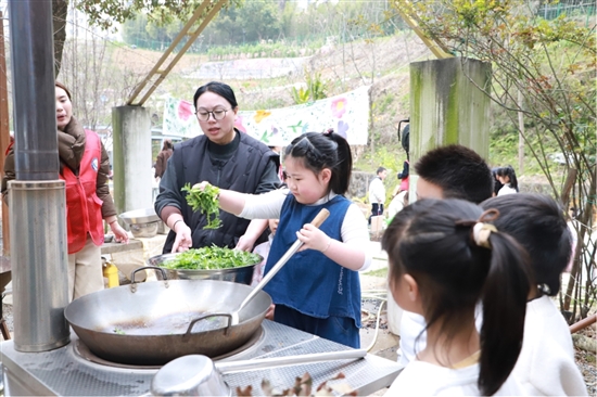 另一边是烹饪区,孩子们在老师的带领下体验炒春菜。三色茼蒿在锅中翻炒,河虾鲜香四溢,孩子们围在灶台边,认真观察食材在烹饪中的变化,感受从土地到餐桌的完整过程。