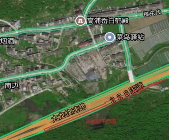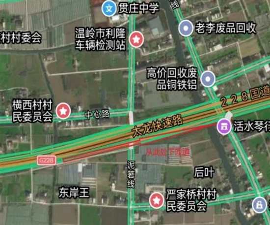 可从肖浦隧道出口处行驶约800米,靠右下匝道,绕行太龙高架地面道路,前往横滨大道及温岭东高速路口。