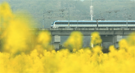春暖时节,城南镇繁花遍野,台州市域铁路S1线列车穿梭于沃野之上,裹挟着清新的春风,勾勒出一幅灵动鲜活的春日画卷。图为一辆列车穿行在长沙村的油菜花田间,与烂漫景致相映成趣。记者 周学军 通讯员 金云国 摄