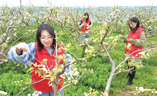 3月31日,在滨海镇“喜梢”共富工坊的60亩早熟梨种植基地里,党员志愿者和果农们一起给梨花授粉。天气转暖,该基地的梨花竞相绽放,当地果农加强果树春季管理,对梨花进行人工授粉,进一步提高坐果率,为丰产丰收奠定基础。