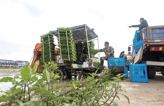 在泽国镇黎明村,农户将育好的秧苗盘搬运到水稻钵苗有序抛秧机上,为机插移栽作业做准备。