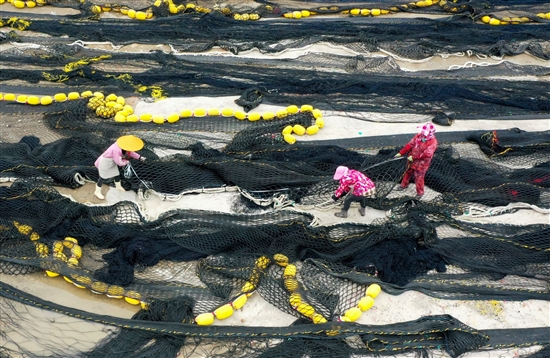 距2026年东海全面休渔期已不到一个月的时间。石塘镇部分渔船已提前归港、停泊休整,岸上的补网修船场地随之迎来“忙碌时刻”。图为石塘镇渔家妇女正在修补渔网。