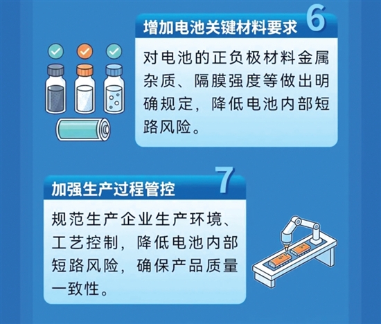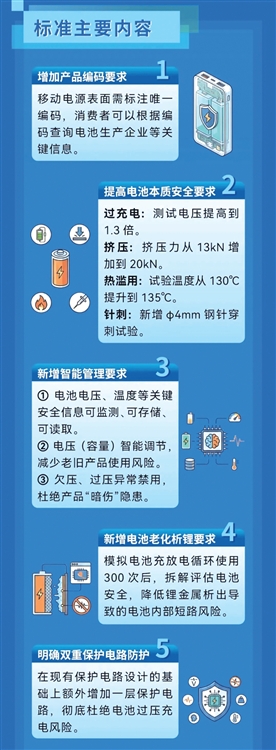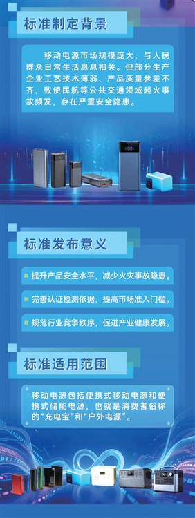 此外,《技术规范》推行产品唯一性编码管理,消费者可通过编码查询电池品牌等核心信息。在生产制造流程方面,明确提出移动电源的原材料、生产过程管控要求,从根源上提升安全水平。新标准设置12个月过渡期。企业在过渡期内,可以选择执行新标准或原有标准,过渡期结束后,必须按照新标准进行生产和销售。