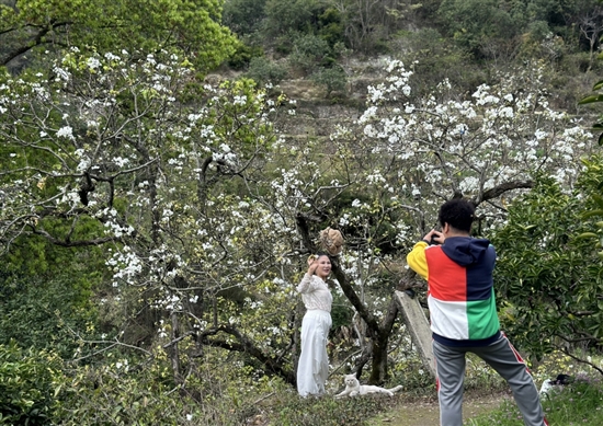 走进乌龙岙,仿佛步入一幅春日画卷。洁白如雪的梨花层层叠叠盛放在枝头。微风拂过,花瓣飘落,游人纷至沓来。天气晴好时,游客人数达到日均近千人次。大家在树下拍照、漫步、跳舞,让原本宁静的山岙变得热闹非凡,充满了生机与活力。